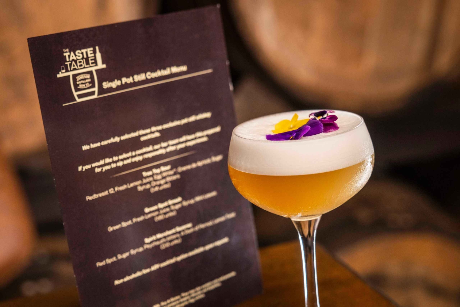 Experimenta o Angels' Share enquanto desfrutas do estilo quintessencial de fabrico do whiskey irlandês, perfeitamente combinado com luxuosos chocolates irlandeses feitos à mão. Desperta os teus sentidos nesta viagem de whiskey em Dublin. Passa uma hora no ambiente íntimo do único armazém de maturação ao vivo da cidade, guiado por um embaixador especializado em artesanato. Prova quatro prestigiados whiskies de alambique da Destilaria Midleton, incluindo o Midleton Very Rare Barry Crocket, o Redbreast e o Red Spot. Desfruta da oportunidade de extrair e provar whisky diretamente do barril e saboreia chocolates artesanais especialmente selecionados, combinados com cada whisky. Leva para casa um presente exclusivo e personalizado como recordação da tua experiência. Após a degustação, relaxa com um delicioso cocktail de whisky de alambique numa área reservada, completando esta viagem pela herança do whisky irlandês.Includes